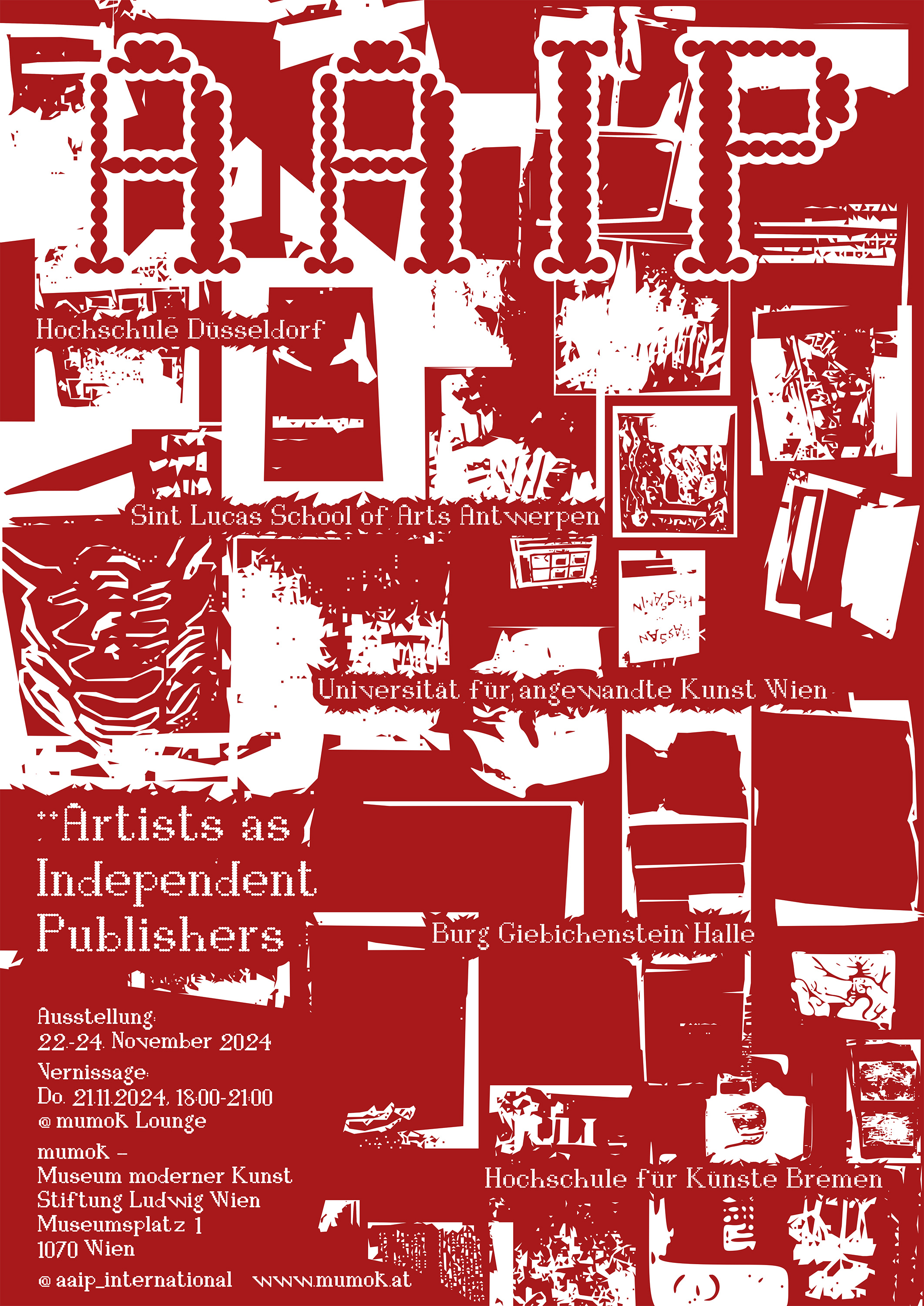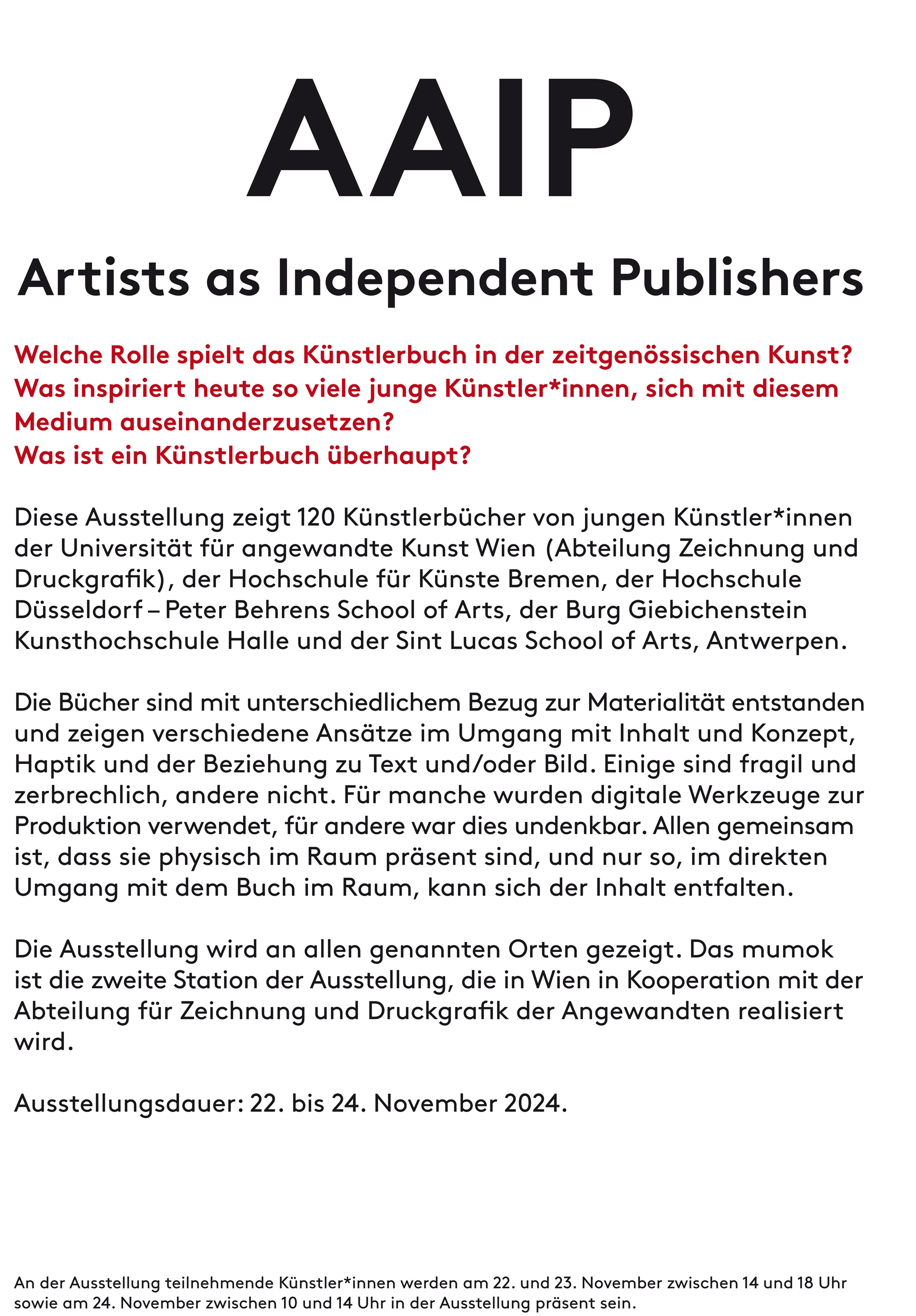 In Zusammenarbeit mit Simone Moser, Leiterin der MUMOK-Kunstbibliothek, hat die Klasse die Wiener Ausstellung des Projekts „AAIP – Artists As Independent Publishers” im MUMOK (Museum Moderner Kunst Stiftung Ludwig Wien) vom 21. bis 24. November 2024 organisiert.