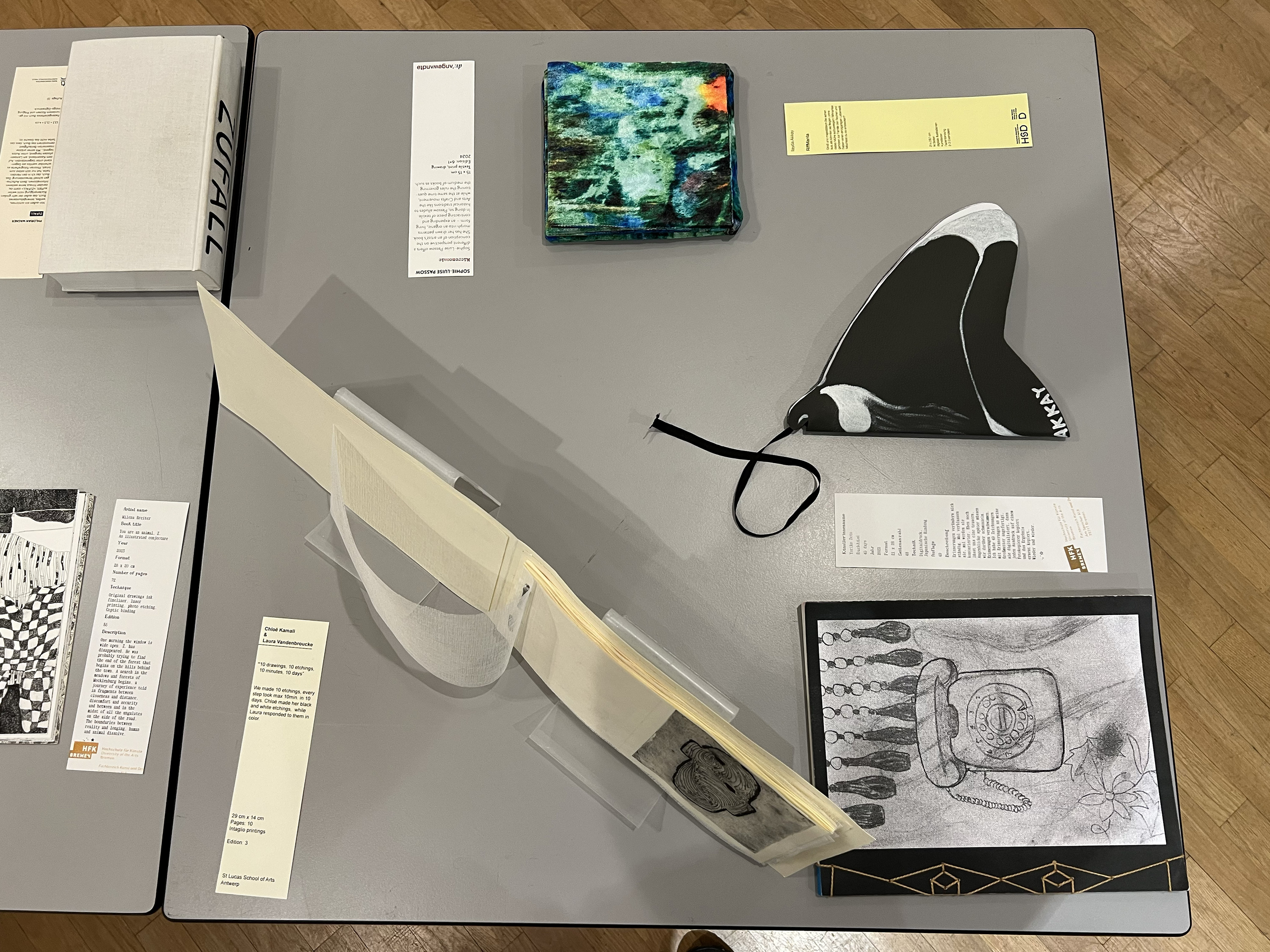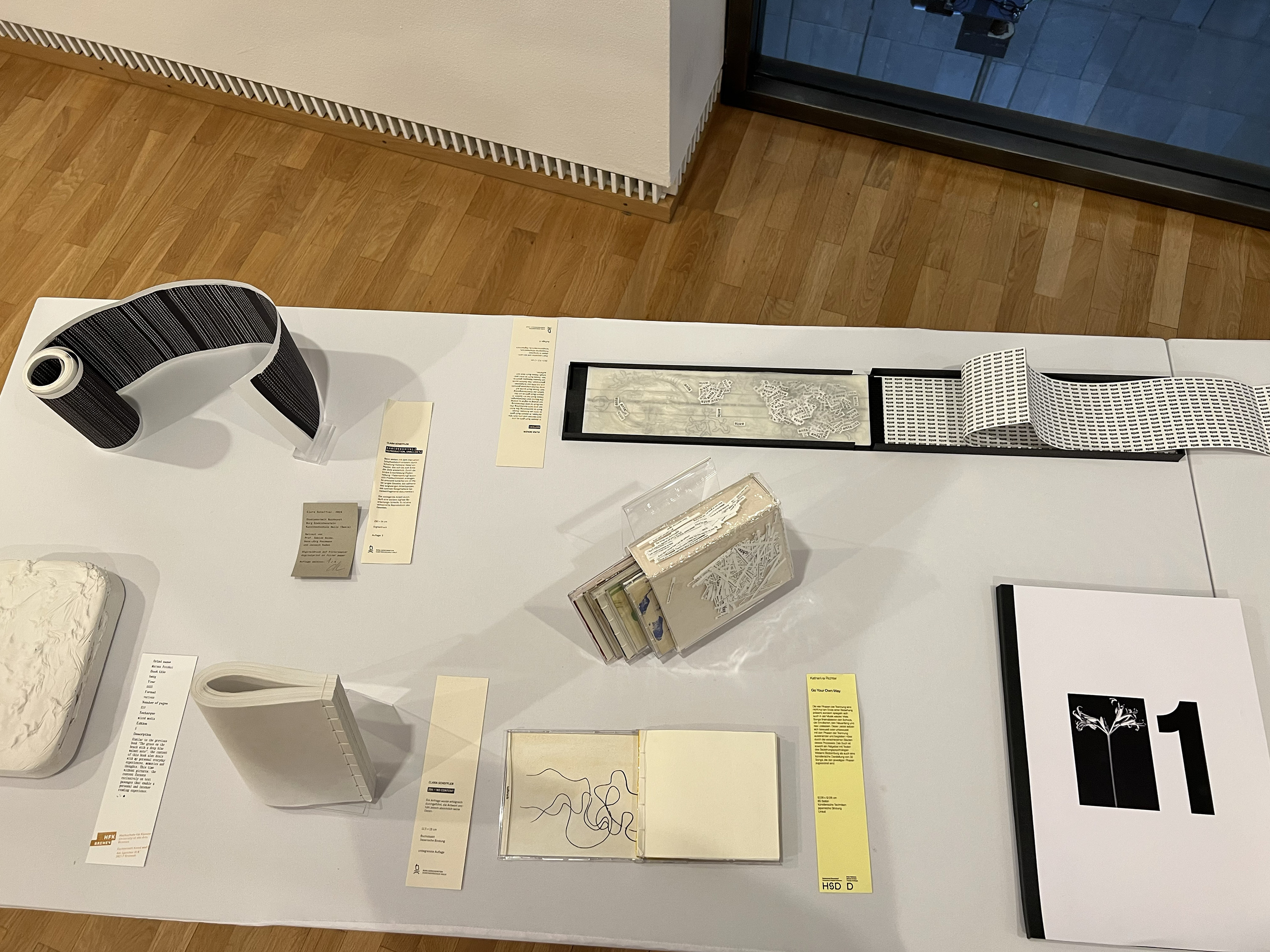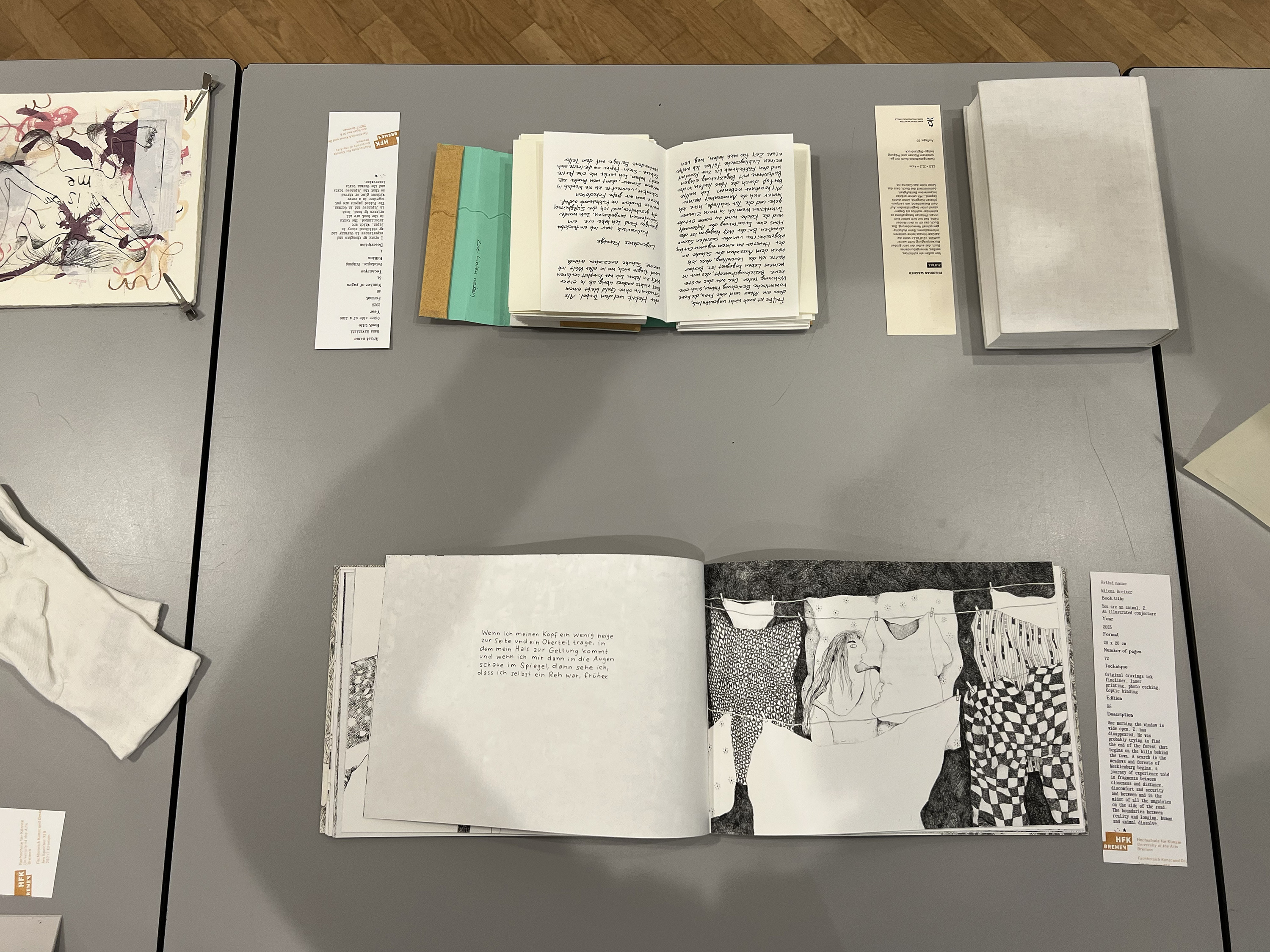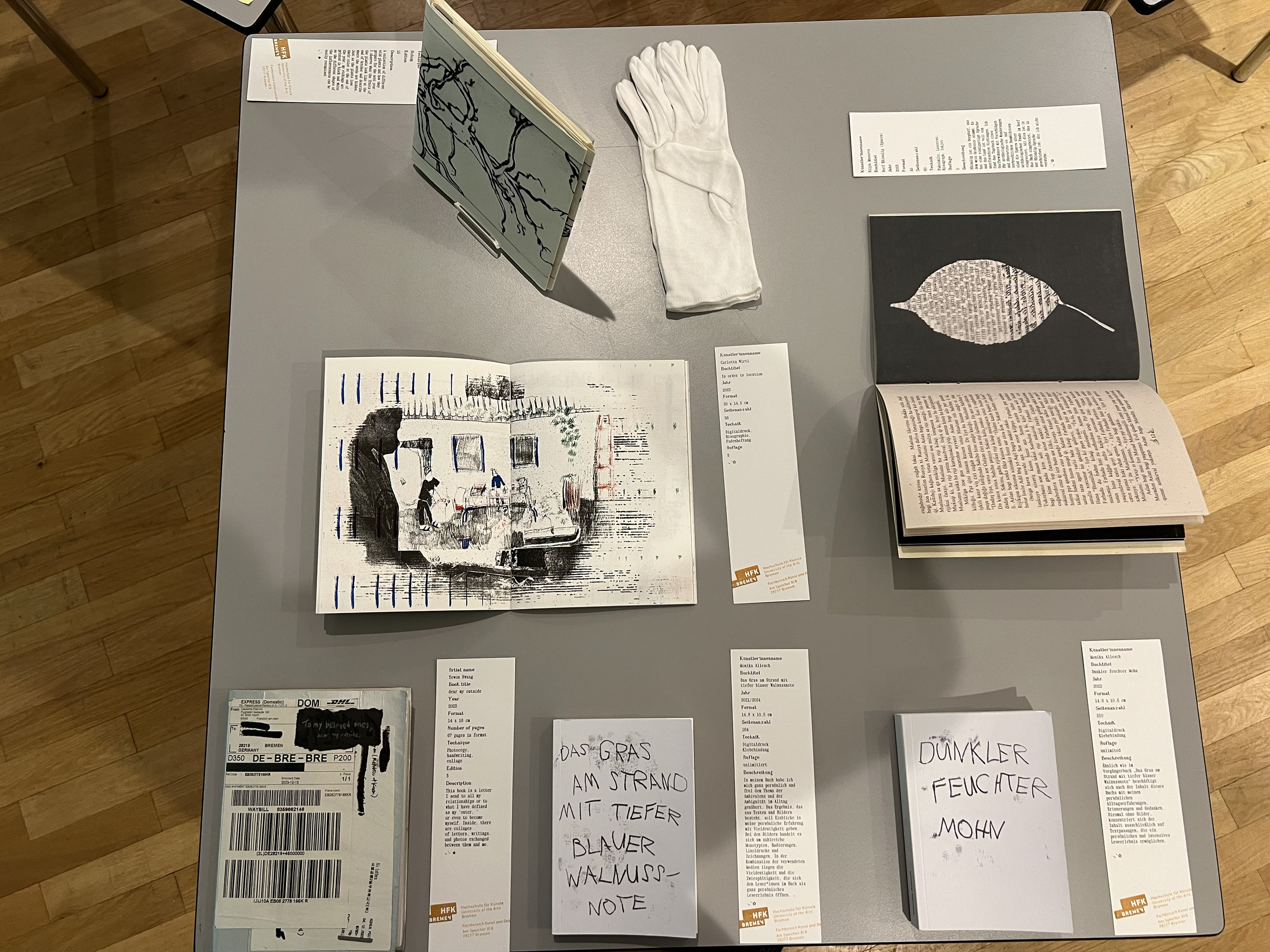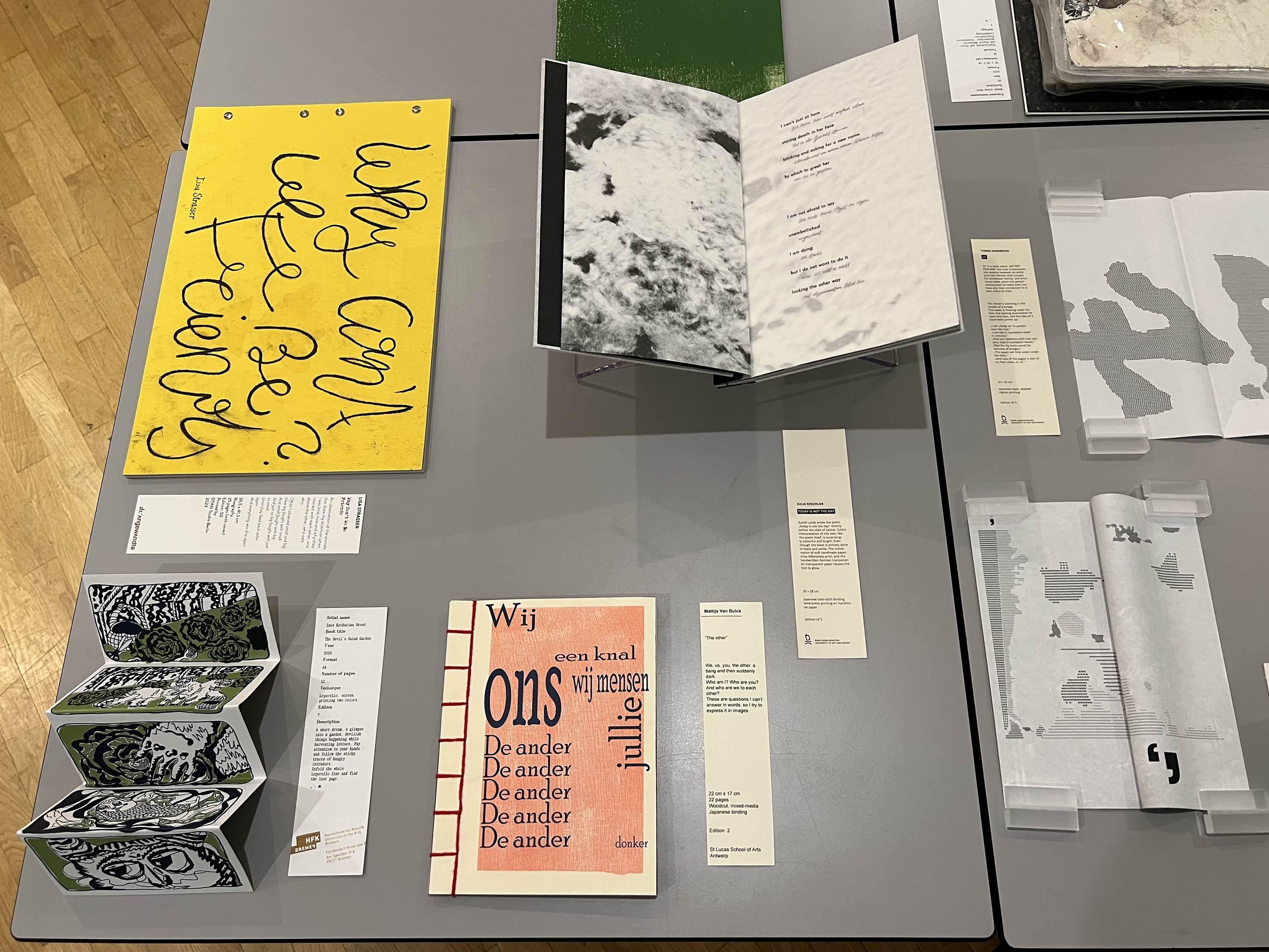 Es wurden 120 Künstlerbücher junger Künstler*innen der Abteilung; der Hochschule für Künste Bremen; der Peter Behrens School of Arts; der Hochschule Düsseldorf; der Burg Giebichenstein Kunsthochschule Halle und der Sint Lucas School of Arts Antwerpen präsentiert.
