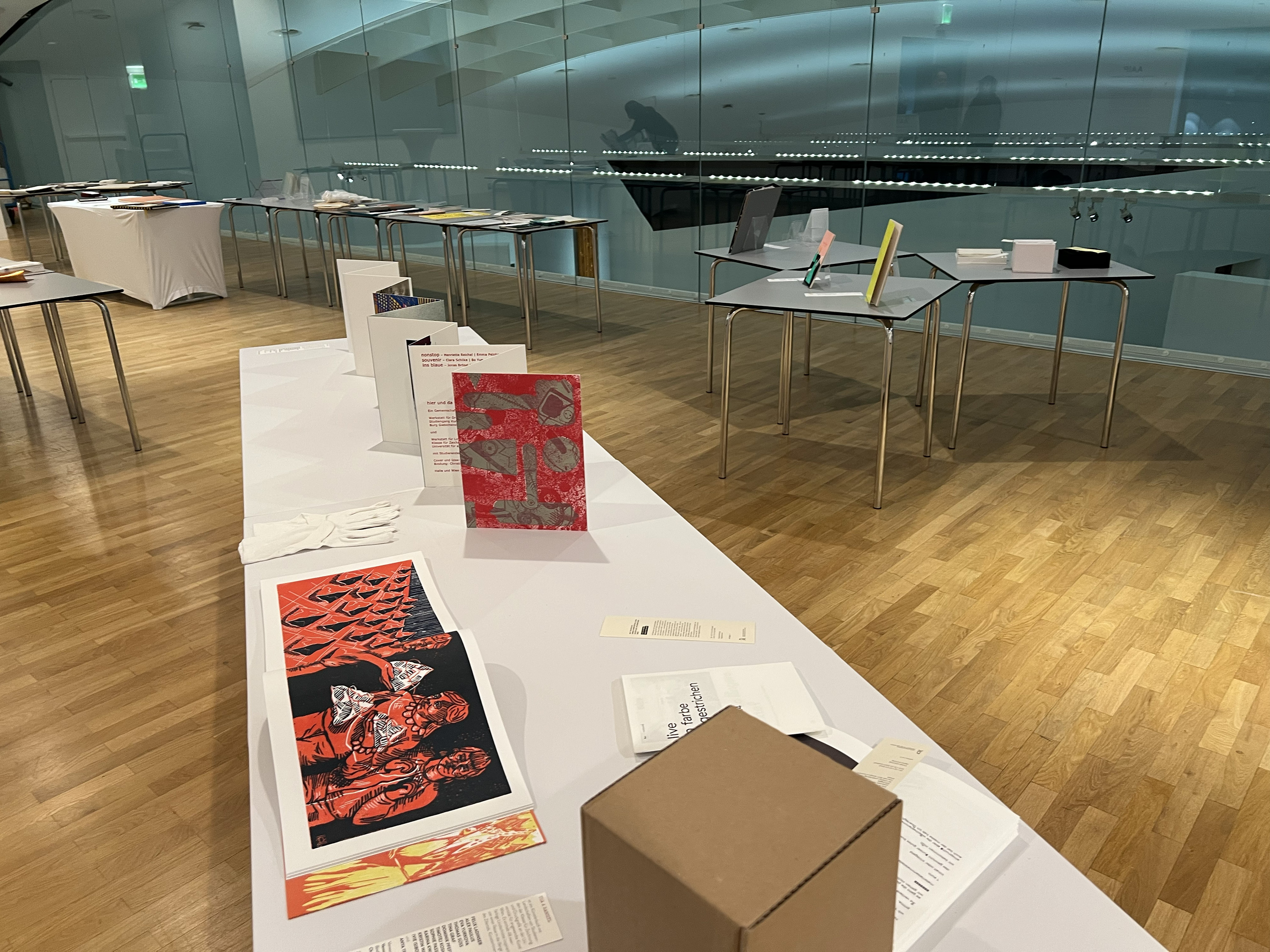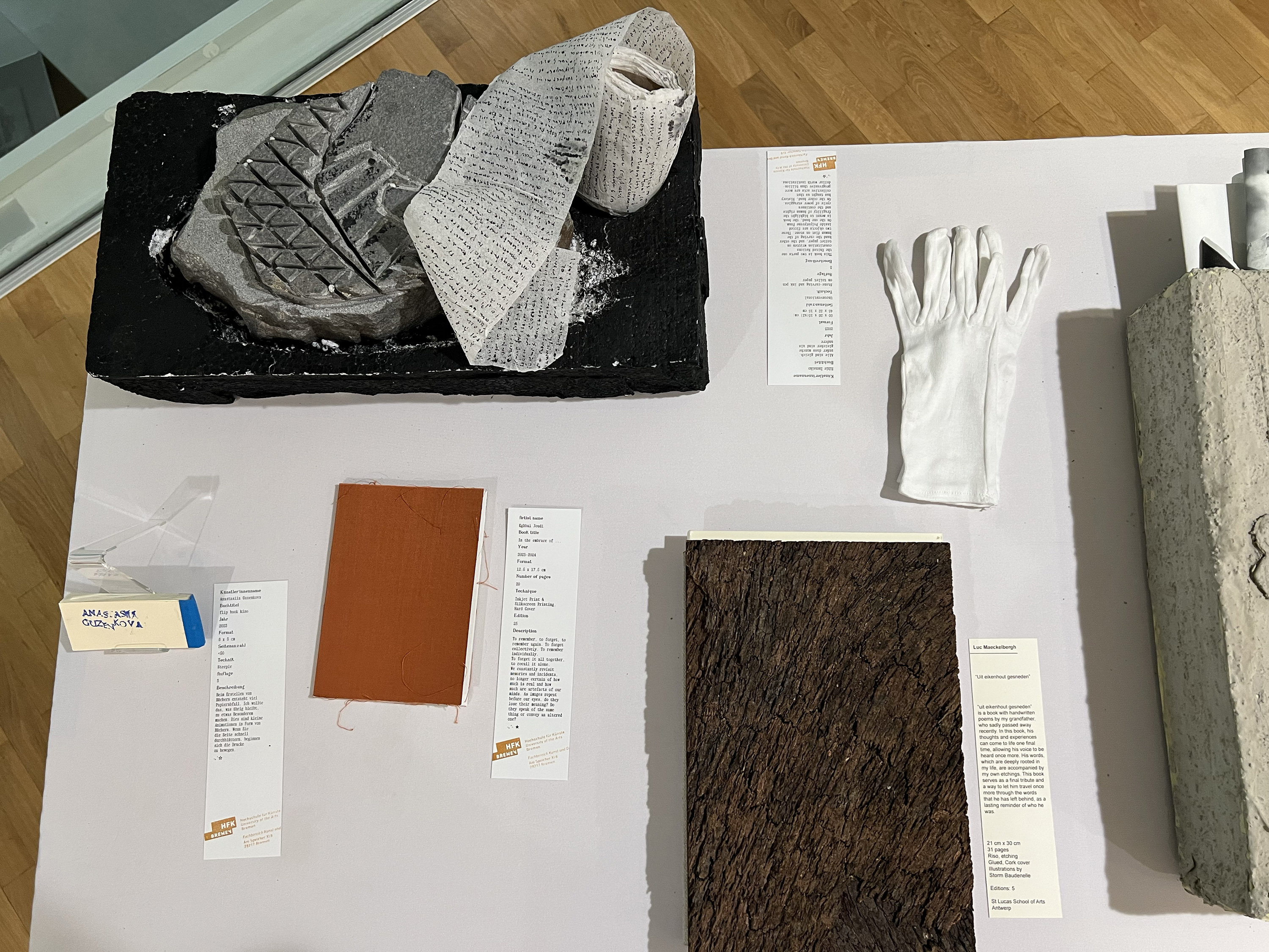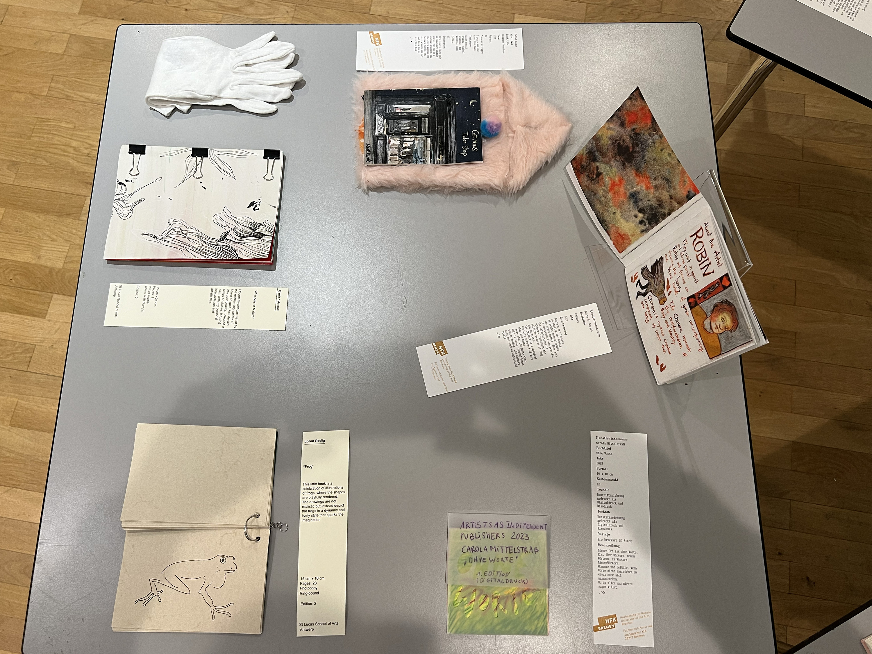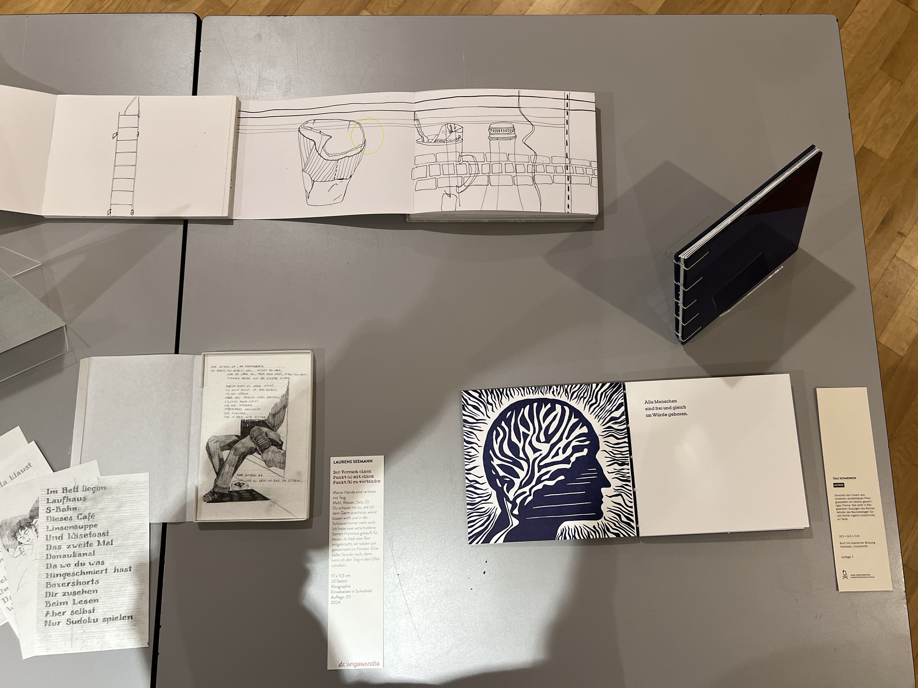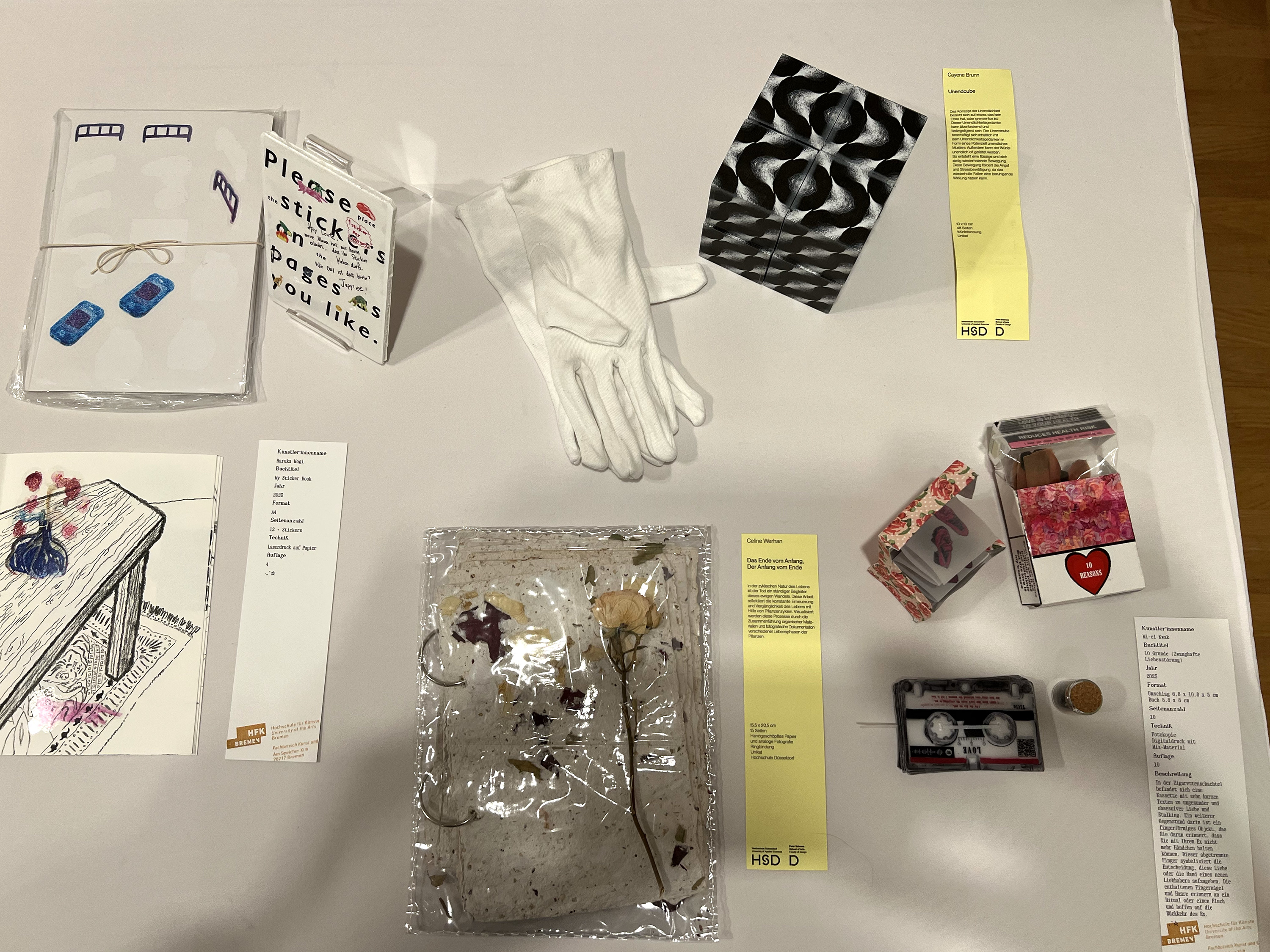Es wurden 120 Künstlerbücher junger Künstler*innen der Abteilung; der Hochschule für Künste Bremen; der Peter Behrens School of Arts; der Hochschule Düsseldorf; der Burg Giebichenstein Kunsthochschule Halle und der Sint Lucas School of Arts Antwerpen präsentiert.