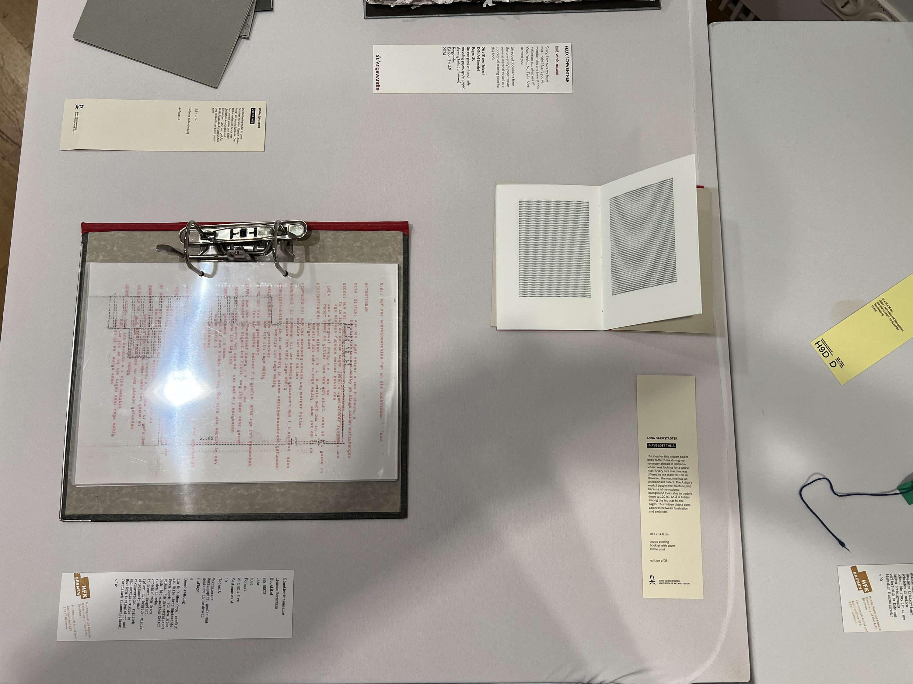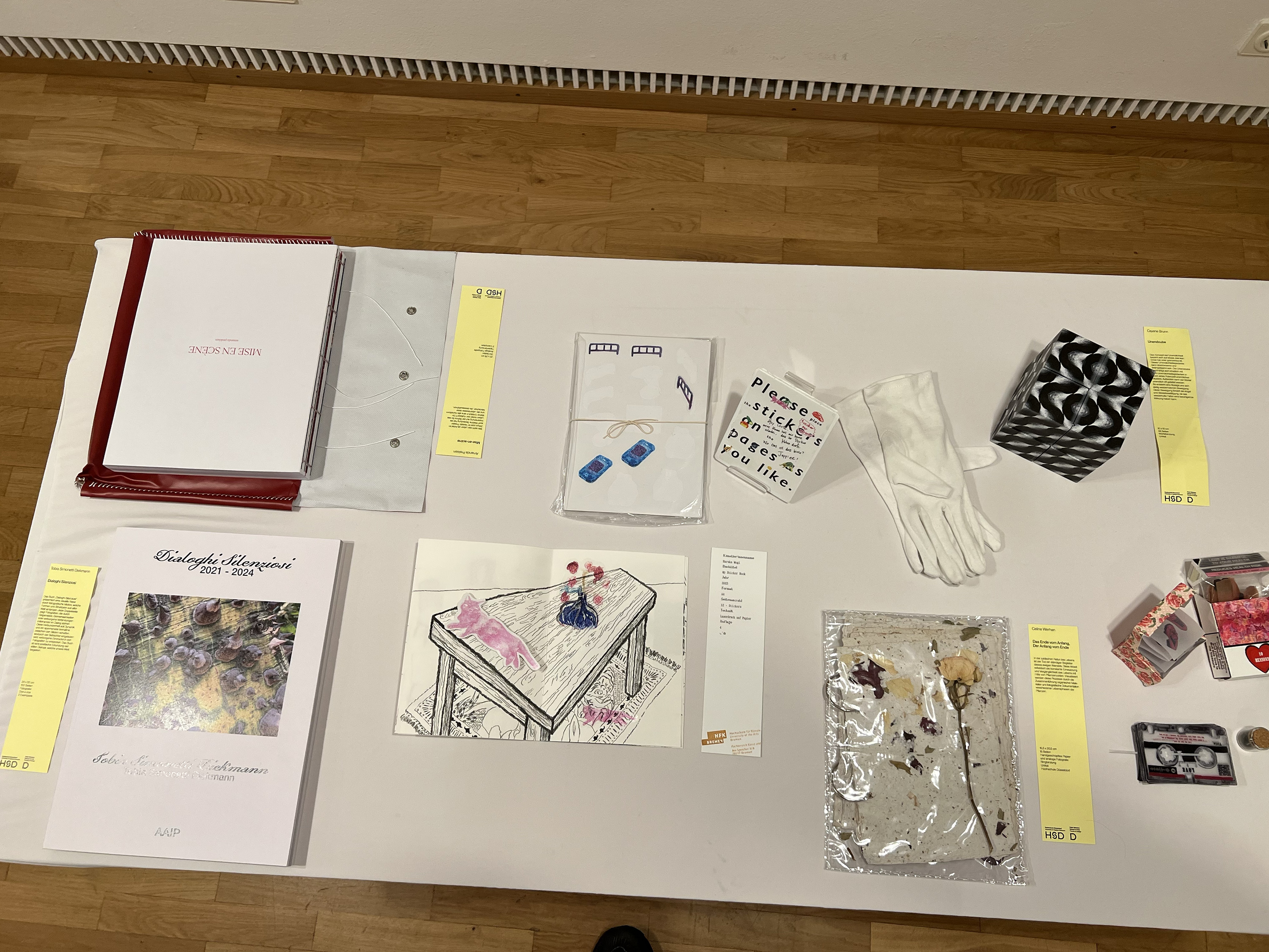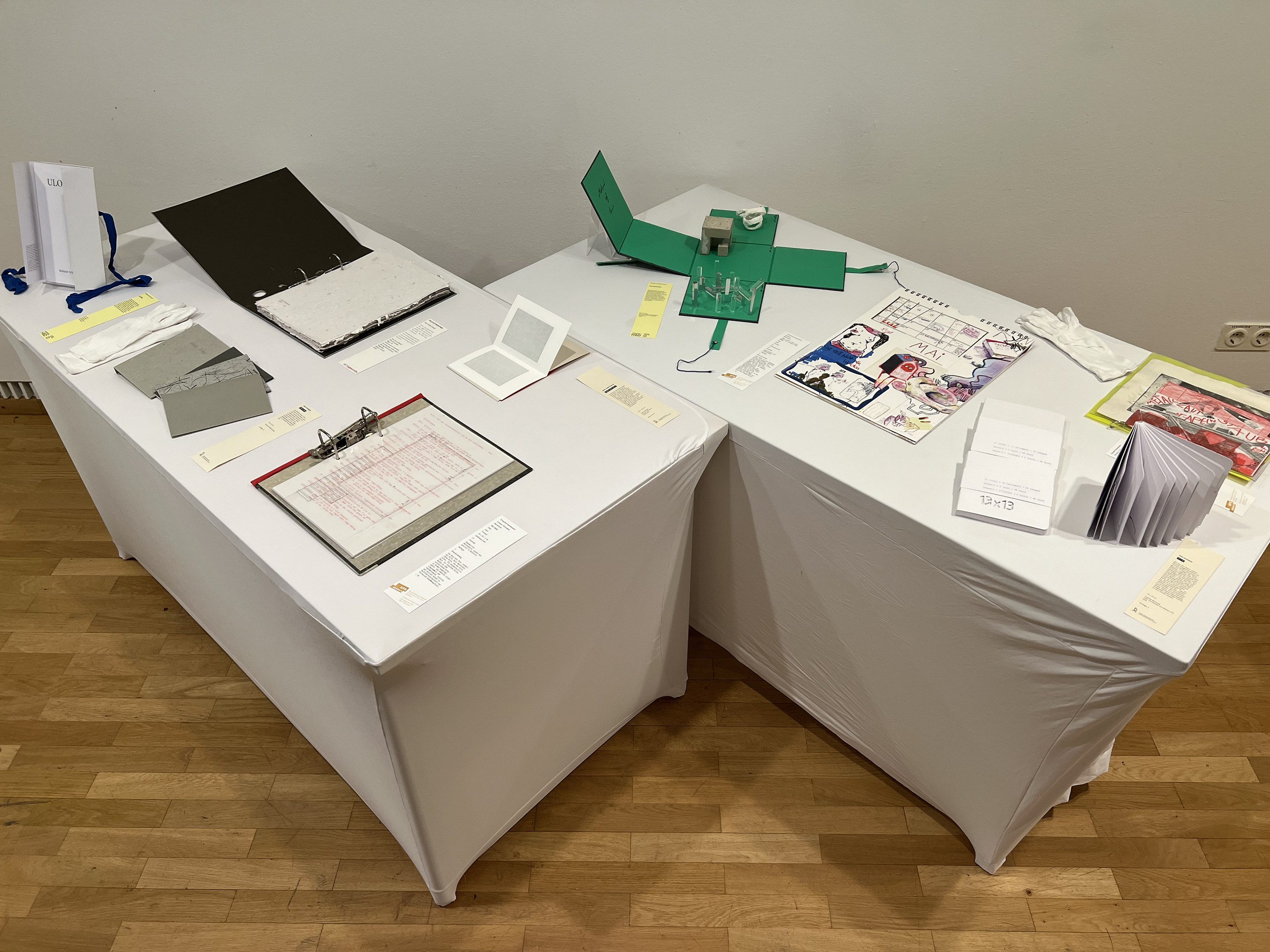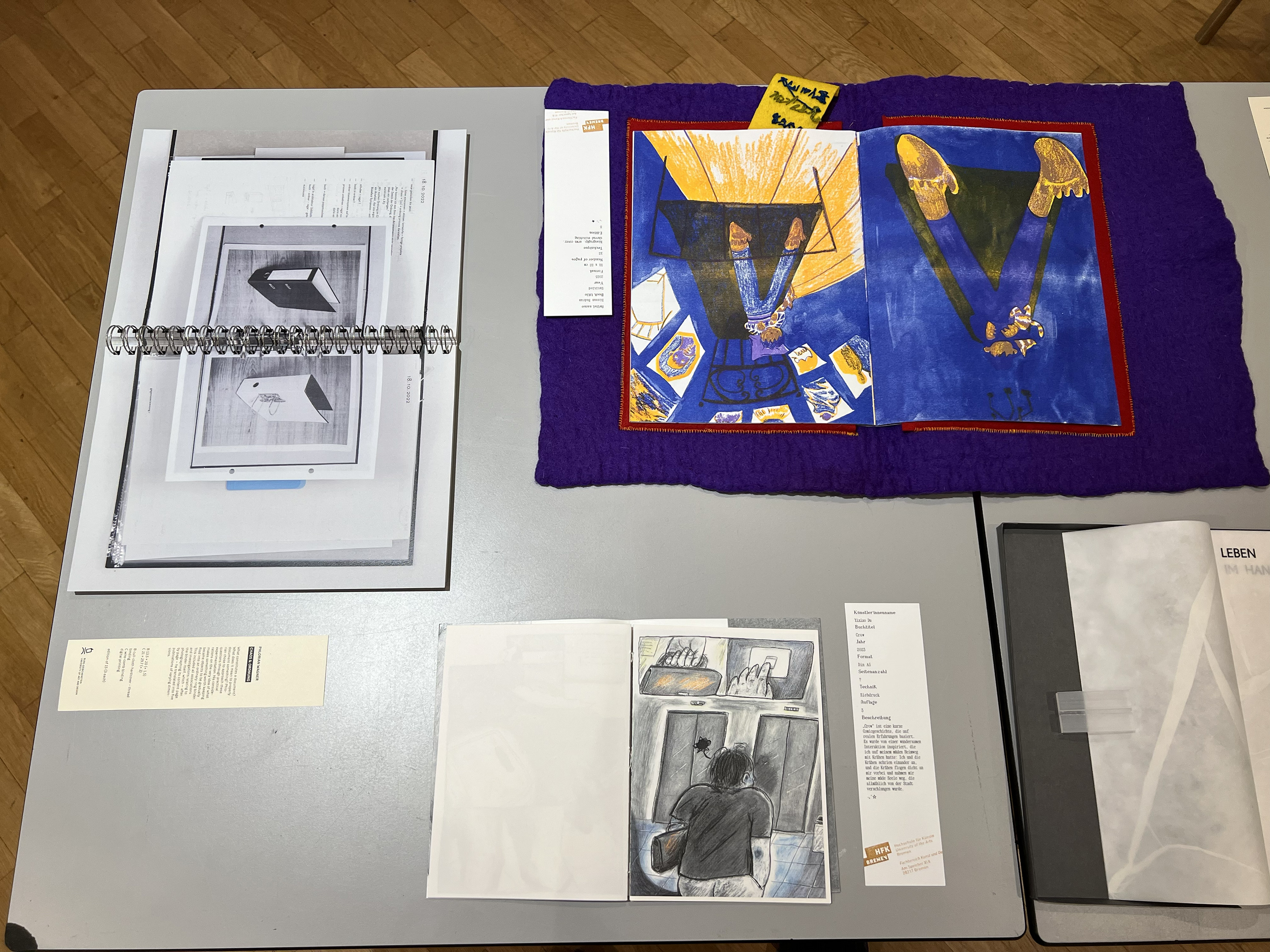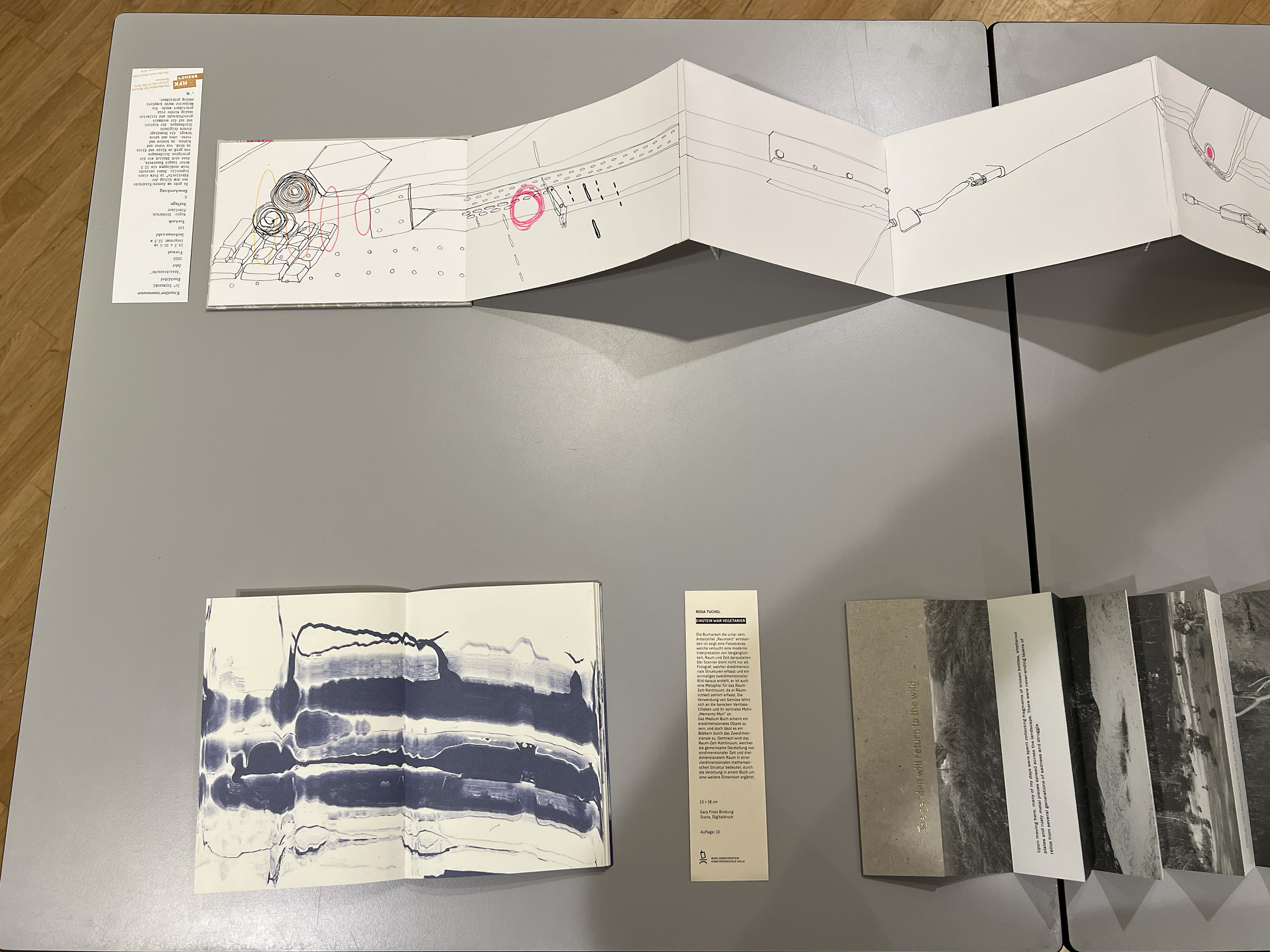 Es wurden 120 Künstlerbücher junger Künstler*innen der Abteilung; der Hochschule für Künste Bremen; der Peter Behrens School of Arts; der Hochschule Düsseldorf; der Burg Giebichenstein Kunsthochschule Halle und der Sint Lucas School of Arts Antwerpen präsentiert.