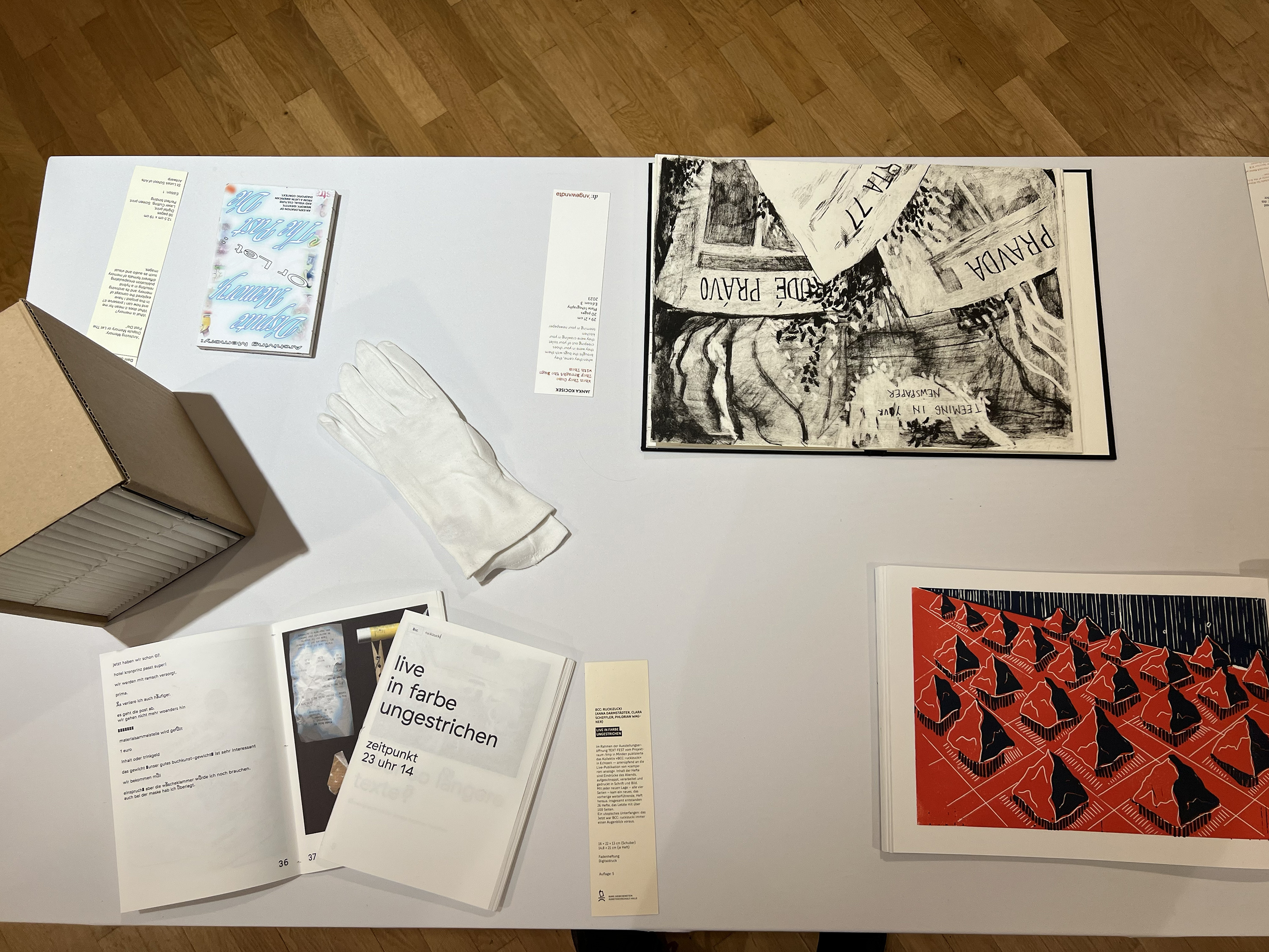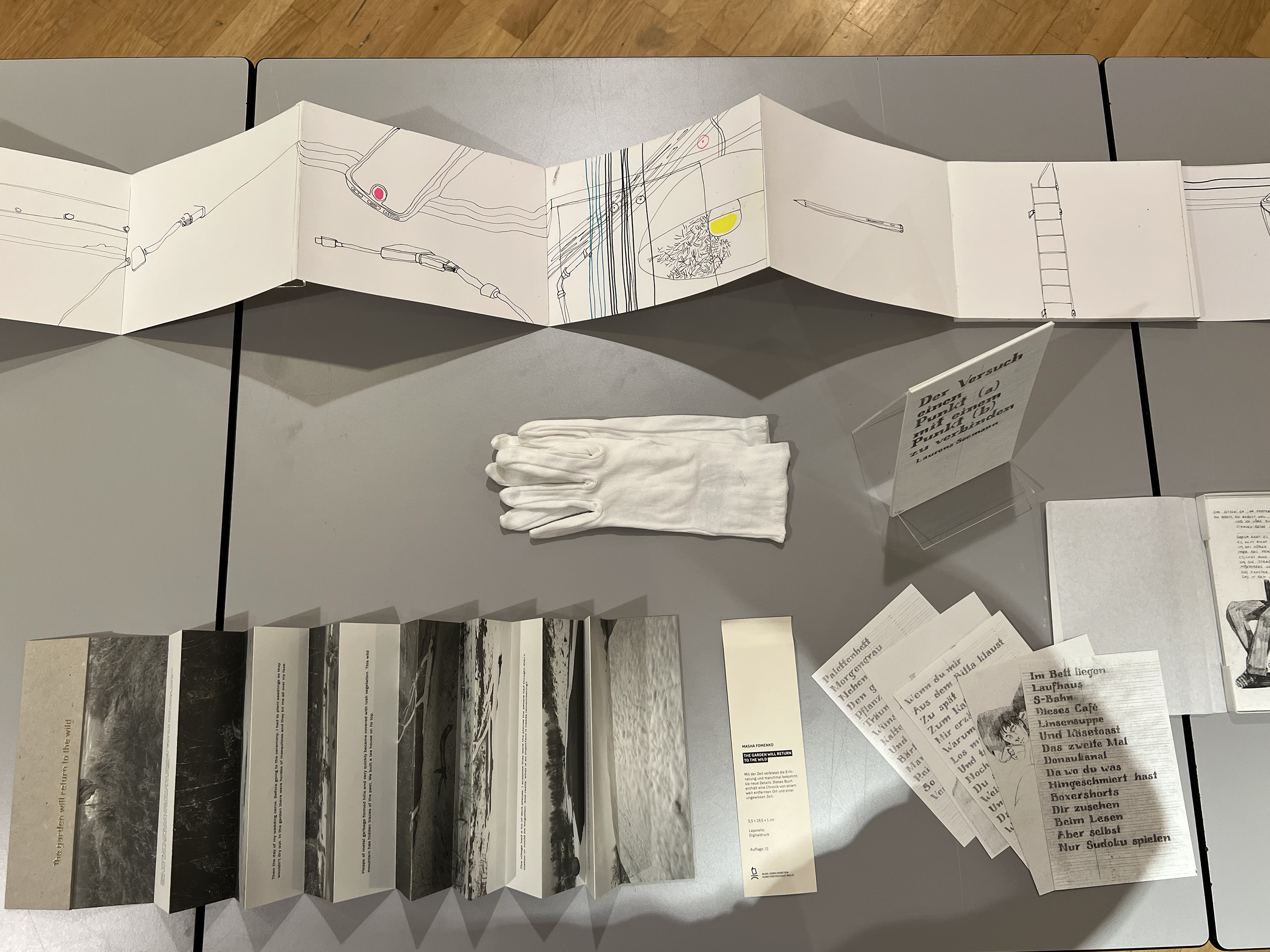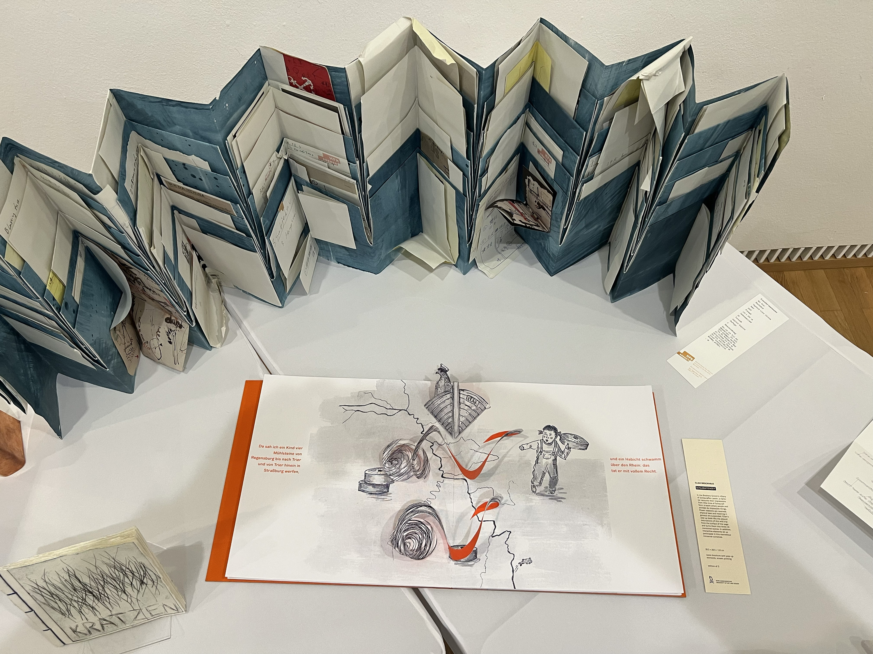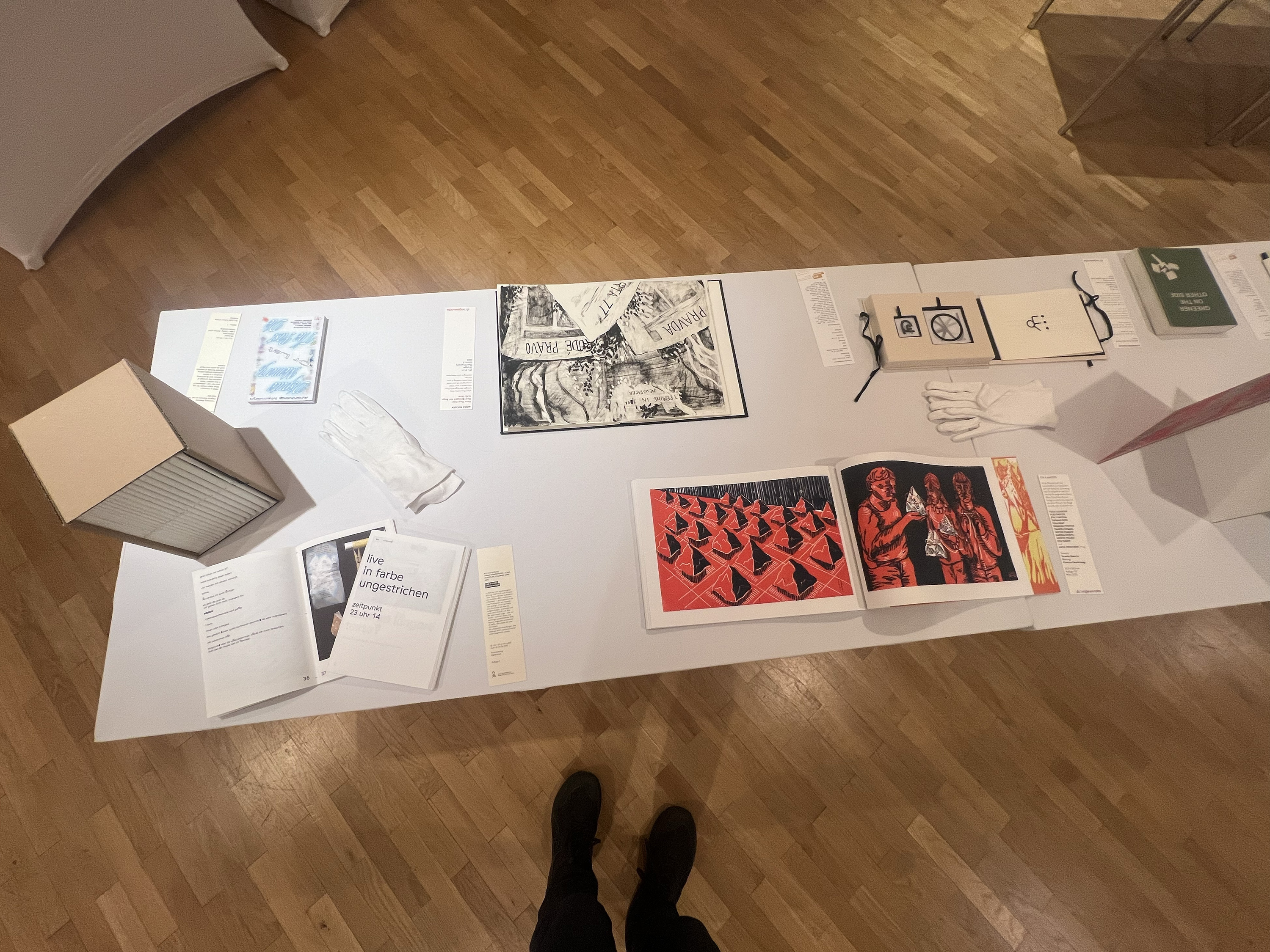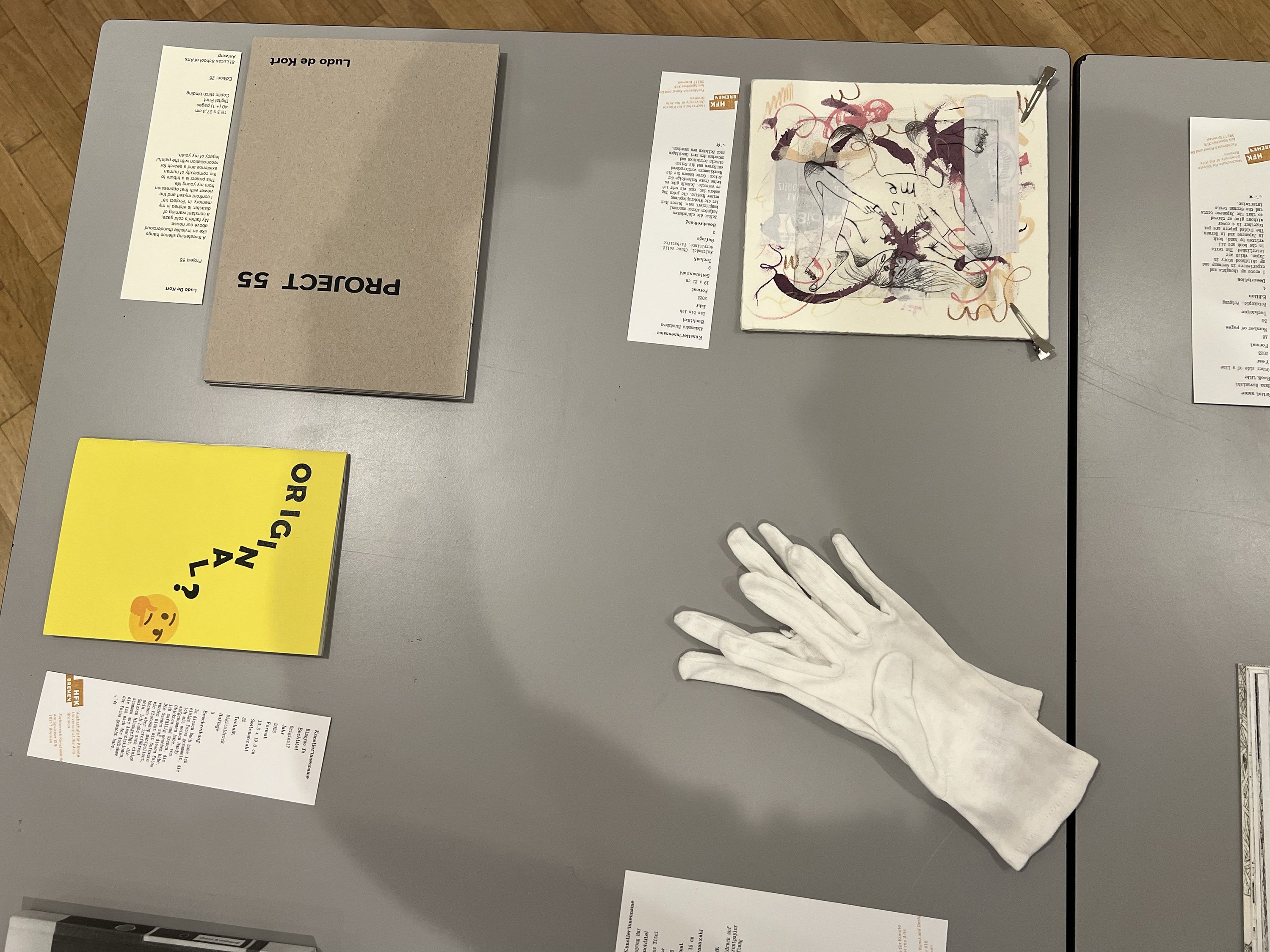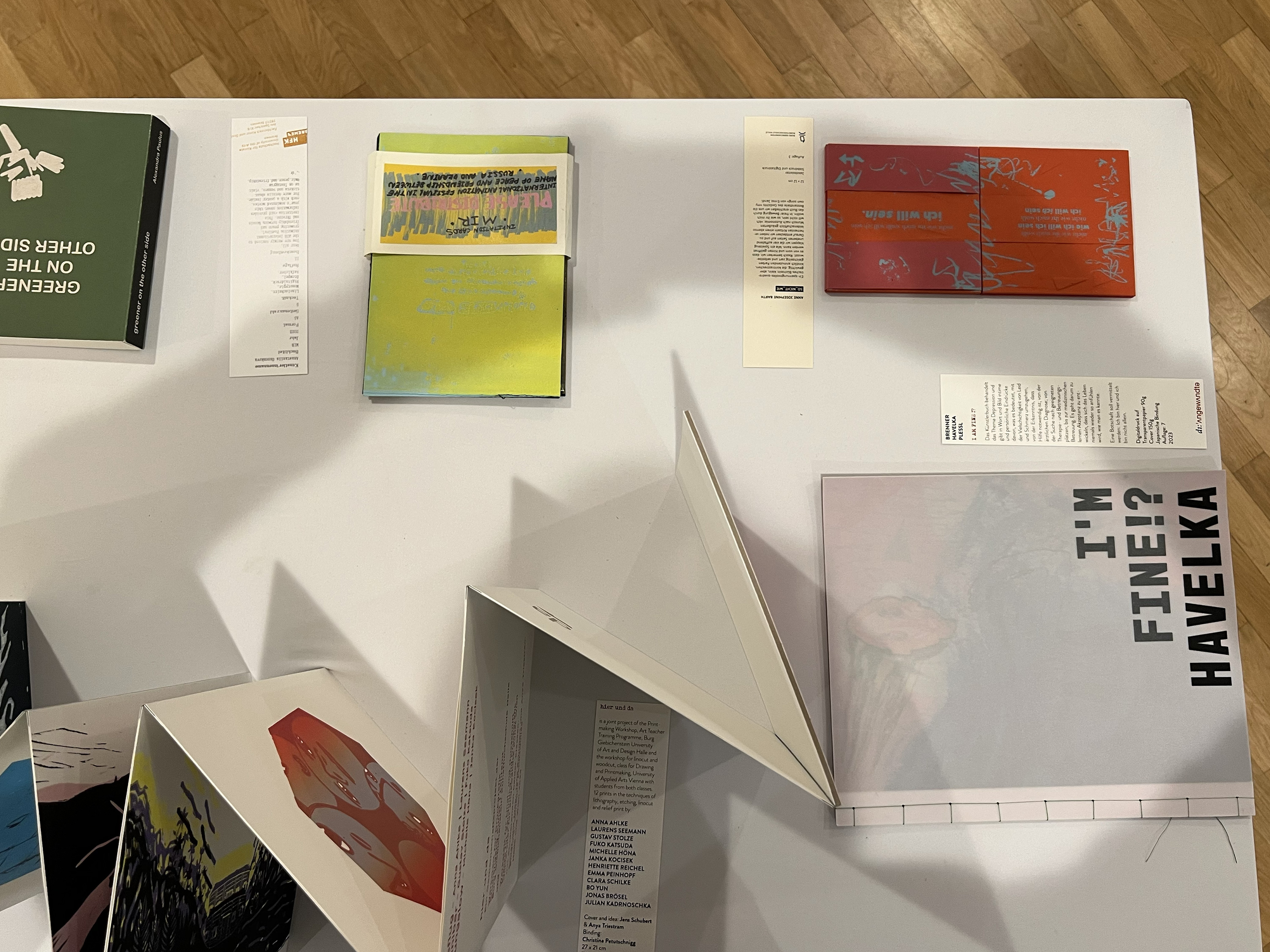 Es wurden 120 Künstlerbücher junger Künstler*innen der Abteilung; der Hochschule für Künste Bremen; der Peter Behrens School of Arts; der Hochschule Düsseldorf; der Burg Giebichenstein Kunsthochschule Halle und der Sint Lucas School of Arts Antwerpen präsentiert.