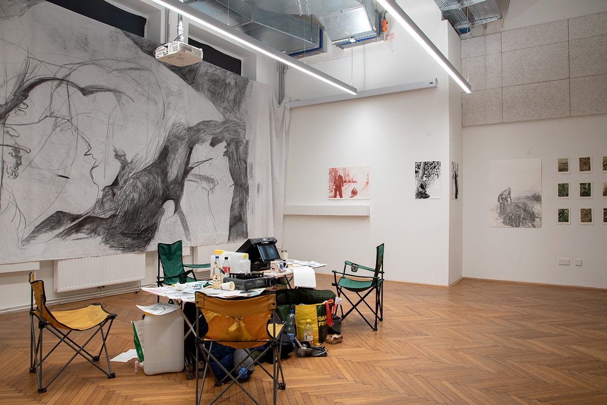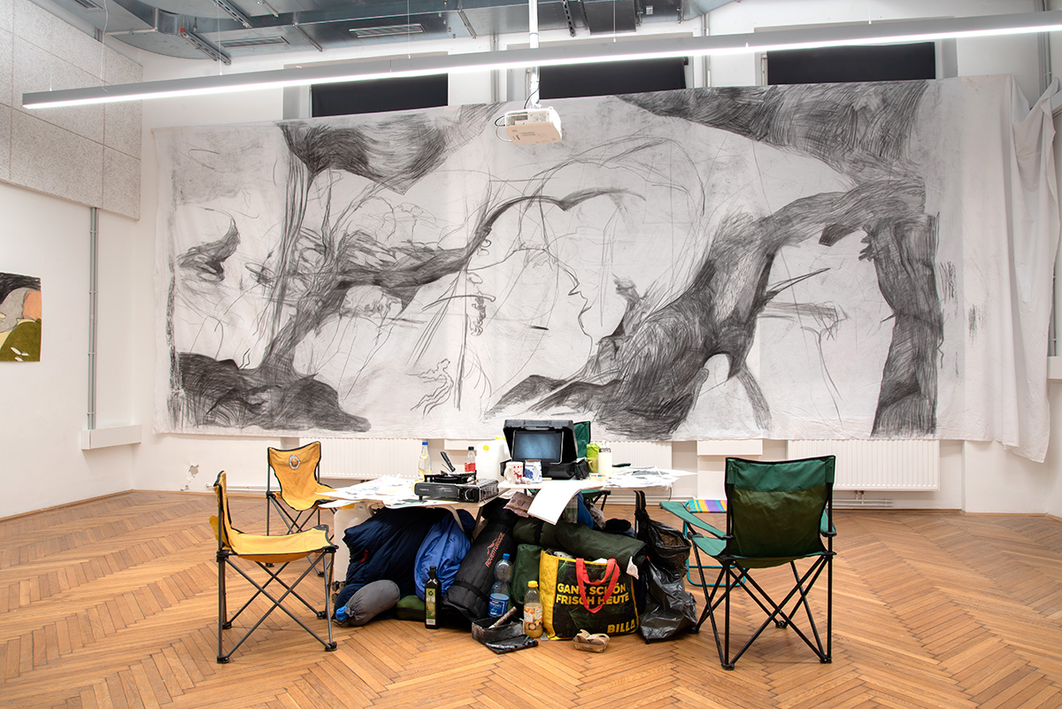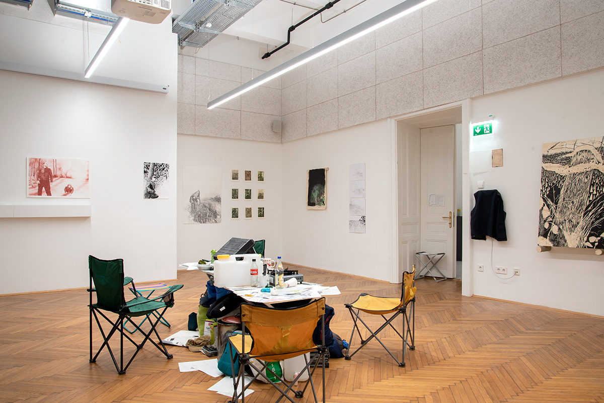 “Auf abenteuerlicher Reise in den Tiefen Oberösterreichs: Die Erstsemester-Studis der Zeichnung und Druckgrafik leben für drei Tage im Wald, trotzen der rauen Natur und lüften ungeahnte Geheimnisse. Werden sie es schaffen, Kunst zu machen? Wird es der Beginn einer Freundschaft oder einer Feindschaft? Und was hat eigentlich der Christbaum damit zu tun?”